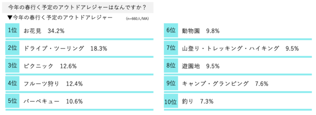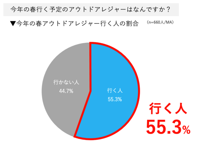 ・この春アウトドアレジャーに行く予定の人は55.3%。今年の人気レジャー第一位は「お花見」、第二位「ドライブ・ツーリング」、第三位は「ピクニック」や「フルーツ狩り」。