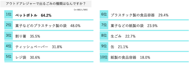 ・アウトドアレジャーで出るごみの種類第一位「ペットボトル」、第二位「菓子などのプラスチック製の袋」、第三位「割り箸」。ペットボトルのごみと回答したのは64.2%も。