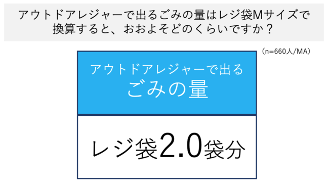 ・アウトドアレジャーで出るごみの種類第一位「ペットボトル」、第二位「菓子などのプラスチック製の袋」、第三位「割り箸」。ペットボトルのごみと回答したのは64.2%。ごみの量については、64.4%がレジ袋Mサイズ1~2袋と回答。平均すると、1人あたり「2袋分」のごみが出ていることが判明。
