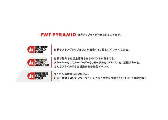 FWTは、自然のままの地形を滑り、そのテクニックやスタイルを競う“フリーライド”の世界一を決めるツアーです。大会区分は3つに分かれ、世界トップライダーからジュニアまで幅広い層が参加します。
