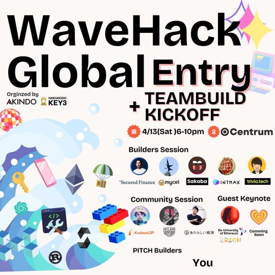 4/13(土)18pmより、コミュニティパートナーの渋谷Centrumにて、WaveHack Globalのキックオフイベントを開催します。グローバルでプロダクト展開をしているビルダーたちのセッションはもちろん、アイデアピッチの時間を設けますのでこの5ヶ月間共にWaveHack Globalを通してビルドしてく仲間を見つけることができます。どなたでも無料で参加できますので、どうぞお気軽にご来場ください。