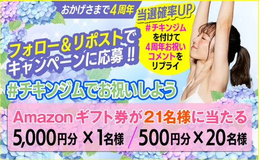 「#チキンジム」を付けて4周年お祝いコメントをリプライして頂くと当選確率UP