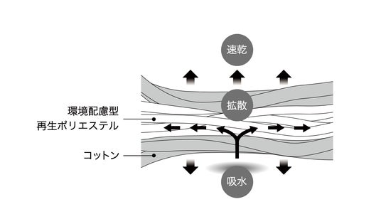 速乾性のある環境配慮型再生ポリエステルを芯に、コットンで包み込んだ二層構造糸を採用。汗をたっぷりかいた肌にも、撫で付けるだけで水分を素早く吸収し、快適な使い心地が続きます。使用後にすぐ乾くため、バッグに収納する際も不快感がありません。