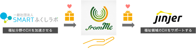 「from Me」の体験会には一定の開催費用がかかりますが、このモデル事業では、一般社団法人SMARTふくしラボが、福祉分野のDXを推進するビジョンの一環として「from Me」の体験会をギフトという形でjinjerへ贈呈し、jinjer株式会社が「from Me」を実践する、初のペイ・フォワード型による企画となります。jinjer株式会社では福祉領域のDXをサポートする「MOVE ON PROJECT」のメンバーが、「from Me」を体験する予定です。