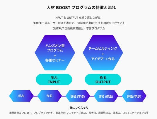 デザイン思考やリーンスタートアップの手法を採用し、アイデア作りに止まらず、ユーザーからの評価を得ることを目的に必ずプロトタイプを生み出すアウトプット重視のプログラム