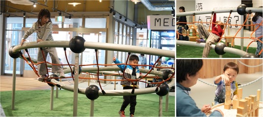 未来の公園をイメージしたスペース。中央には、木の上にいるような不思議な浮遊感が楽しめる遊具を設置。ぐるぐると動き回ったり、くつろいだり、遊び方自由自在の遊具です。