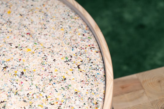 カラフルなリサイクルボード机の天板はアコスターポリボードという、再利用が難しい古紙とプラスチックをリサイクルした、環境にやさしい素材を使用。生まれ変わった廃材たちが、カラフルにストアを彩ります。