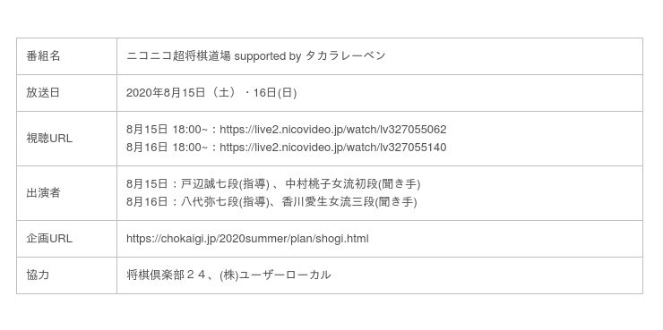 2020年8月9日(日)~16日(日)の8日間にわたり開催する日本最大のネットの夏祭り「ニコニコネット超会議2020夏」において、将棋企画「ニコニコ超将棋道場」を8月15日(土)・16日(日)に生放送することをお知らせします。