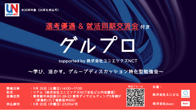 株式会社えにさむ(代表取締役本間大輝)は、11月25日(土)にグループディスカッション特化型勉強会「グルプロ」を開催いたします。世界と日本を繋ぐ港湾物流サービスを展開する株式会社ユニエツクスNCT様にご協賛をいただきます。