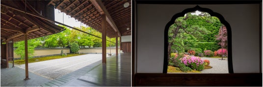 写真左:大徳寺 黄梅院 方丈庭園 / 写真右:大徳寺 興臨院 花頭窓