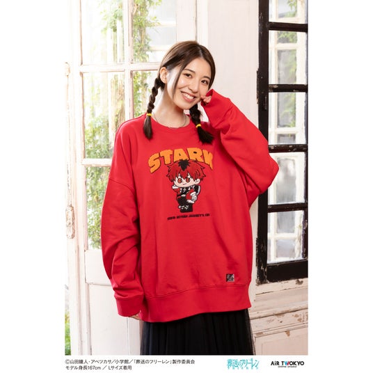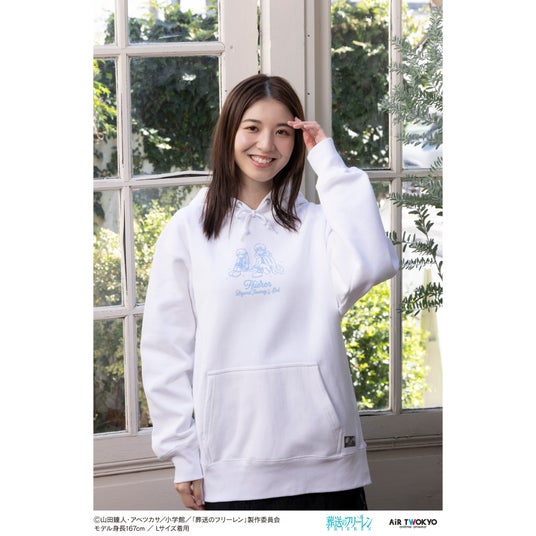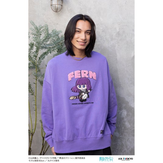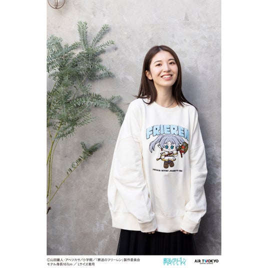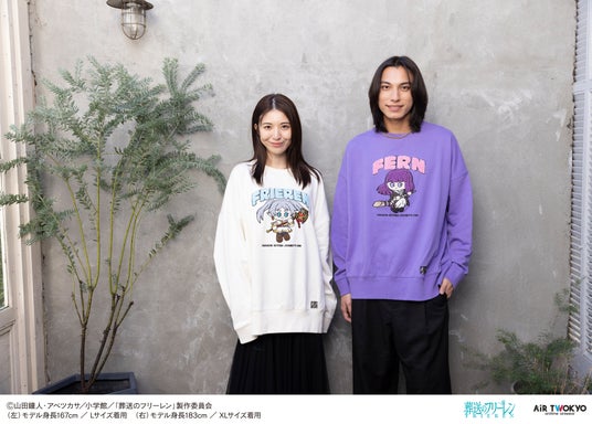 左(女性モデル):TVアニメ『葬送のフリーレン』 第2弾 相良刺繍スウェット(フリーレン)、右(男性モデル):TVアニメ『葬送のフリーレン』 第2弾 相良刺繍スウェット(フェルン)