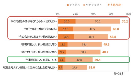 ・約7割の人が、同僚との関係性維持を望んでいる。また、過半数が今の業務、会社での継続勤務意向を示している。