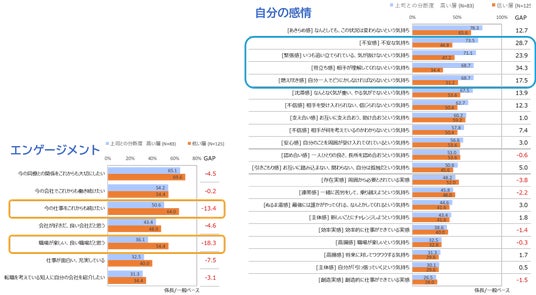 ・上司との分断度が高い人と低い人のエンゲージメント指数をみると、ほとんどの項目において、20~30%もの大きなGAPがあった。