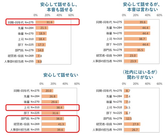 ・同期・同年代が最も本音が言える結果となったが、その数値は高くはなく、約4割の人が本音を言えないことが分かった。