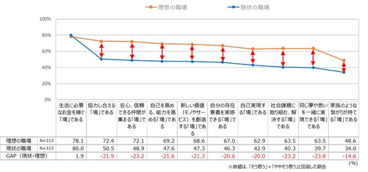 ・理想の職場と現状の職場では、お金を稼ぐ「場」という回答が共にトップであった。