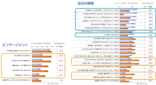 ・マネジャー層は、その上司との分断度が高い人はエンゲージメント指数が低く、感情レベルも低いことが分かった。