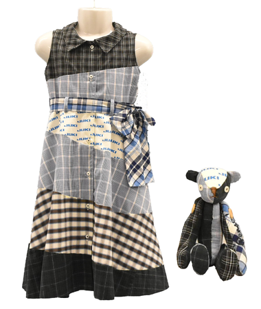 デザインコンセプト:家族の思い出が詰まった洋服をリメイクしたワンピース。夏休みにお出かけをし、さらに思い出を増やしていくアルバムのような一着。父親の洋服を娘へ、兄のおさがりが妹へのプレゼントヘ。残った端切れは、クマのぬいぐるみの詰め物として活用。