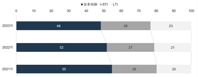報酬ミックスの平均値は基本報酬:短期インセンティブ(STI):中長期インセンティブ(LTI)=48:28:23であった。総報酬に対して基本報酬の占める割合は減少し、STI、LTIの占める割合は増加した結果、変動報酬(STIとLTIの合計)の割合が50%を超えた