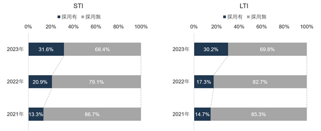 STI・LTIで採用されている財務指標を調査しました。STIについては、2021年、2022年に続き、利益、売上高といった収益性指標の採用が上位にあがりました(図表3)。また、ROE(株主資本利益率)、営業利益率といった指標の採用が増加傾向にあります。