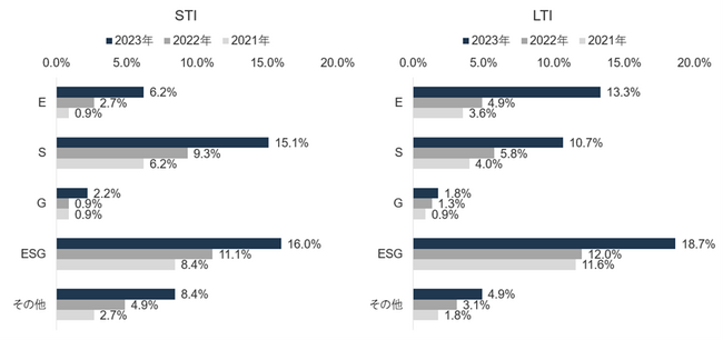 役員報酬の業績評価指標に将来財務指標を導入する企業の割合は、STIで31.6%、LTIで30.2%であり、それぞれ昨年から10.7pt、12.9ptと大きく増加しました(図表5)。その内訳をE/S/G(Environment(環境)/Social(社会)/Governance(企業統治))の領域別にみると、STIでは品質・安全性や従業員エンゲージメントなどのS指標が、LTIではGHG排出量などのE指標を採用する企業がそれぞれ最も増加していることがわかります(図表6)。なお、STIまたはLTIのいずれかのKPIに将来財務指標を導入する企業数は52.0%であり、おおよそ調査対象の2社に1社の割合で将来財務指標を採用しています。