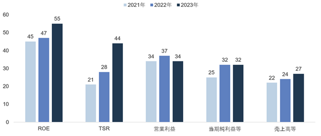 LTIについて、収益性指標だけでなく、効率性指標である株主資本利益率(ROE)や株主価値を表す指標である株主総利回り(TSR)がより多く採用されているのが特徴です。本年の調査では、特にTSRの採用数が、昨年から大きく増加しました(図表4)。