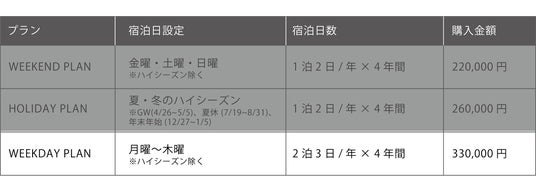 当事業は、4年分の宿泊権を一括購入するライセンス形式の滞在プランです。特定の拠点に4年間の間、毎年1泊ずつ滞在することで、ご利用者に【新しいふるさと】をつくっていただきます。【新しいふるさと】とは、プライベートと非日常を大切に、エリアの本当の魅力を味わい何度も訪れたくなる地域・場所を指します。毎年同じ時期に同じ場所に滞在をすることで、帰りたくなるご自身のふるさとを見つけていただきたいと考えています。