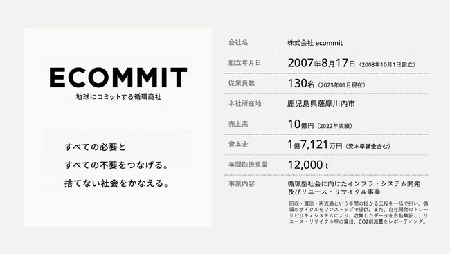 モノの循環の仕組みをつくる環境ベンチャーである株式会社ECOMMIT(本社:鹿児島県薩摩川内市 代表取締役:川野 輝之、以下「ECOMMIT」)は、日本郵政キャピタル株式会社(東京都千代田区、代表取締役社長 丸田 俊也、以下「日本郵政キャピタル」)を引受先とする第三者割当増資を実施し、資金調達を行いました。