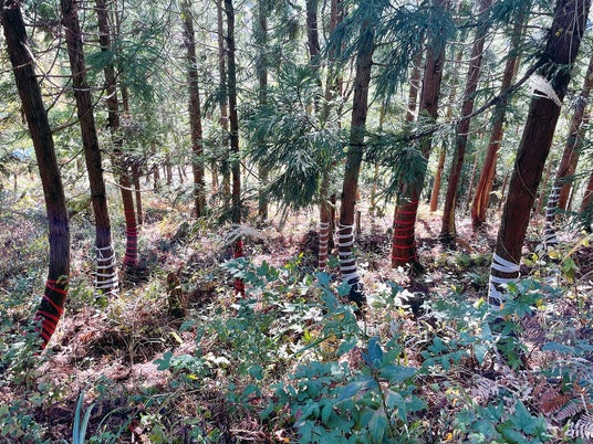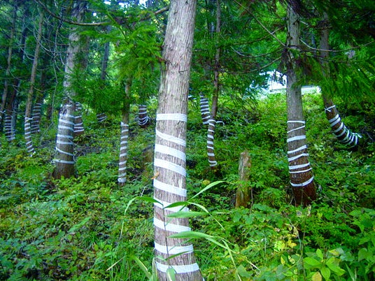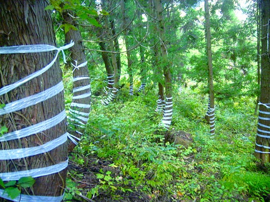 物理的な防除として、樹木に荷造りテープをらせん状に巻き付ける「テープ巻」が一つの有効な手段となっています。爪や牙・角にテープが絡まることなどでクマやシカが嫌がりますが、一方で、経年劣化によってちぎれたり、害獣に剥がされて散乱したテープが山林ゴミとなる環境への影響も心配されています。