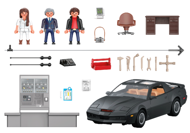 「ナイト2000」は、『ナイトライダー』に登場する、電子頭脳「K.I.T.T.」やハイテク機能を搭載したドリームカーです。プレイモービルとなった本アイテムでは、ダッシュボードや回転するナンバープレートなど、劇中のディテールを細部まで再現しています。