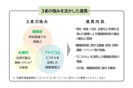 今後、札幌市における環境教育等をより実効性のあるものとするため、環教研の設立や、株式会社アドバコムが発行する子ども環境情報紙「エコチル」の創刊20年目を契機に、行政・学校教員・企業が役割分担の上で連携して環境教育等を推進するという先進的な環境教育等モデルの構築を目指し、本協定を締結します。
