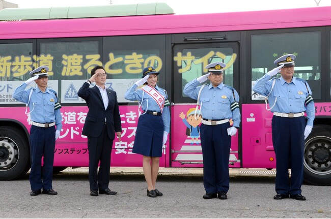 9 月16 日に行われた⻘森県運転免許センターでの「秋の全国交通安全運動」出動式会場では、警官の制服に身を包んだタレント・王林さんも「一日交通部長」として臨席。交通ルール遵守を訴えるデザインでラッピングされたバスがお披露目され、王林さんの「出動!」のかけ声とともに「交通取締部隊」の隊員たちがパトロールに向かいました。