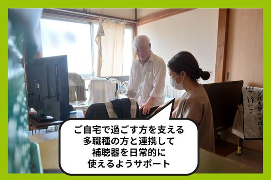 当社では、ご自宅や入居中の施設に訪問し、日々過ごされている生活の中で、補聴器の調整を実施することで、日常生活でしっかり使える補聴器にしています。ご家族との会話がスムーズになるだけでなく、テレビをつけて、ボリュームが10下がった、普段使っている体温計の音が聞こえた、など、生活している環境にお邪魔させていただくからこそできることです。また、補聴器を着けることが難しければ、ヘルパーさんに使い方の説明をしたり、補聴器に慣れるのに時間がかかりそうであればケアマネージャーさんに連絡し、補聴器を毎日つけているかの声かけをしてもらうように連携したりするなど、地域全体で支えられるよう、多職種連携も実施しています。