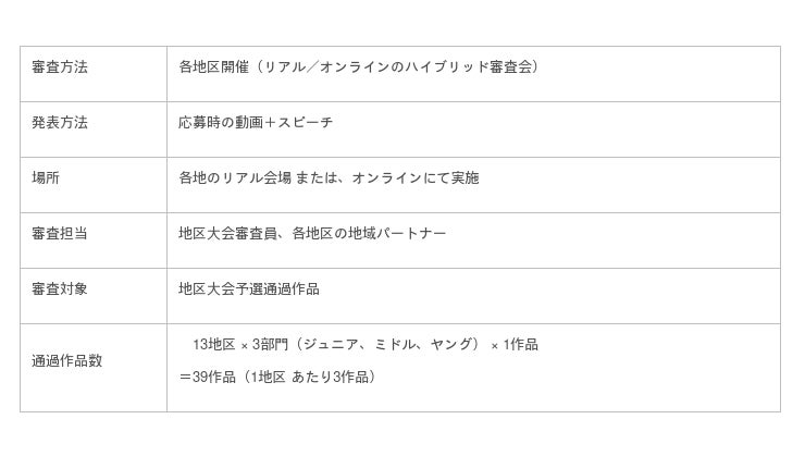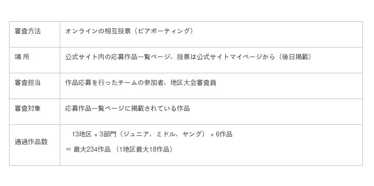 地区大会予選では、作品応募を行ったチーム・地区大会審査員によるオンラインの相互投票(ピアボーティング)を実施します。全国を13のブロックに分けた地区ブロックの中から、3部門ごとに最大で上位6作品が選出され、地区大会本選に進むチームが決まります。