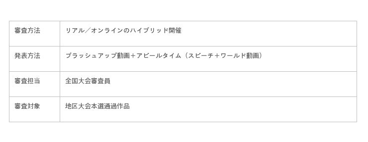 全国大会では、大会公式YouTubeにてリアルタイム配信を行います。 各分野の専門家や大会パートナーによる審査と合わせて、地区大会本選と同じようにオーディエンス投票も実施。同日には、部門ごとに最優秀賞をはじめとする各賞を決定し、表彰式も同日に行われます。