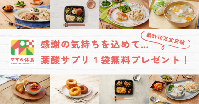 “ママに休養と栄養を届ける”宅食サービス「ママの休食(ままのきゅうしょく)」を運営する株式会社MYPLATE(本社:東京都渋谷区、代表取締役:川端史紀)は、累計10万食突破記念キャンペーンとして、お弁当定期便のプレママ向けプランを新規で購入された方を対象に、「葉酸サプリ30日分1袋を無料」でご提供いたします。