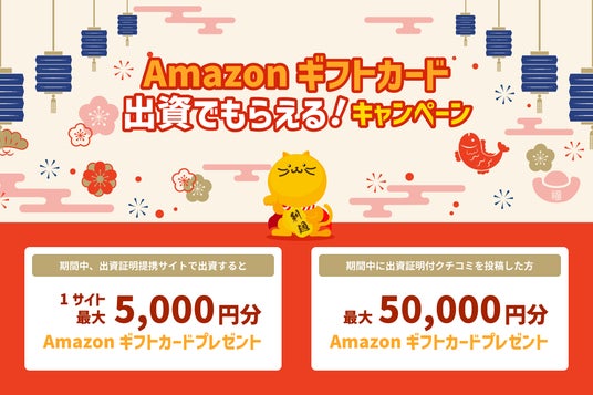 出資証明クチコミを投稿し公開された方全員に「Amazonギフトカード500円分をプレゼント」します。1人100件分のクチコミが対象で、最大50,000円分まで獲得可能です。