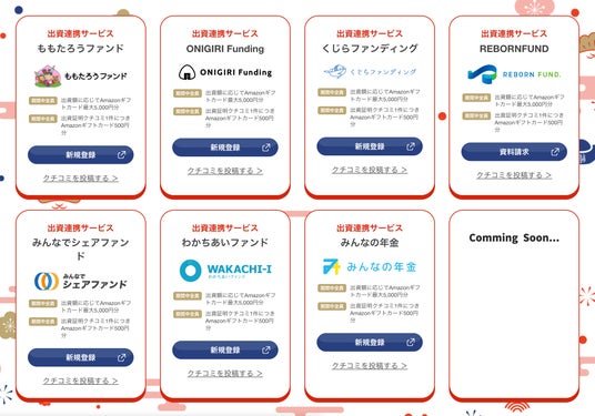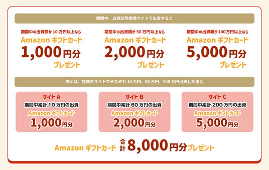 期間中、対象サービスで出資をすることで、出資額に応じてAmazonギフトカードをプレゼントするキャンペーンです。