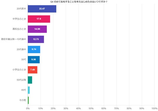 20代前半の時期に脱毛を考え始めたと回答した割合が全体で最も高く、22.47%に上ります。また10代の49.18%が中学生の頃に脱毛を考え始めていると回答しています。