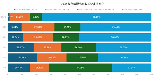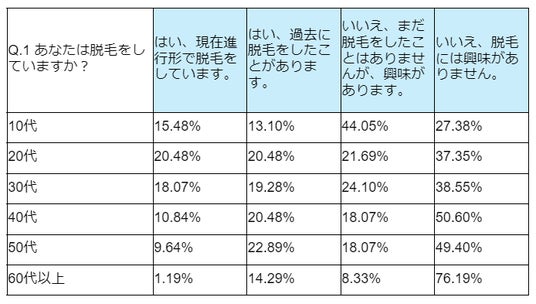 「いいえ、脱毛には興味がない」46.6%調査によると、10代と20代では、現在進行形で脱毛をしている人の割合が比較的高いものの、年齢が上がるにつれてその割合が減少しています(例:10代で15.48%、60代以上で1.19%)。脱毛に興味があるが、まだ行ったことがない人は若い層に多く、特に10代では、44.05%が脱毛に興味があるがまだ行ったことがないと答えています。20代、30代でもその割合は20%以上と比較的高いです。