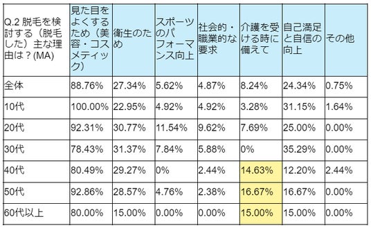 ・脱毛の理由に、40代以上の約15%が「介護を受ける時の備えとして」と回答。40代以上で介護を意識した脱毛を検討している様子がみられた。