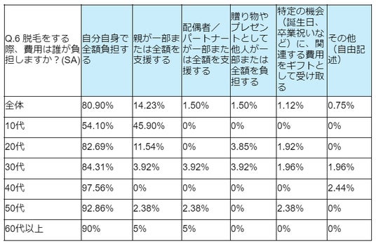 全年代を通じて脱毛費用は大多数が自分自身で全額負担している(全体で80.90%が自己負担)との回答でした。10代の回答者のうち、45.90%が親が一部または全額を支援すると回答しており、この年代で親の経済的支援を受ける割合が他の年代に比べて顕著に高いことがわかります。