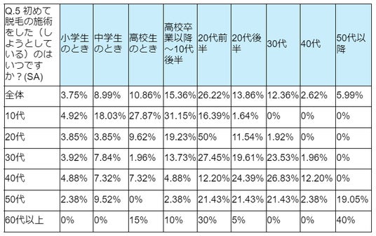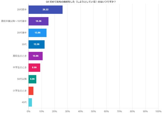 ・実際に脱毛をする年齢としては、高校卒業後の10代から20代前半の施術開始が最も多い。小学生時点から施術開始しているとの回答も、現時点ではまだ5%未満ではあるものの見受けられた。