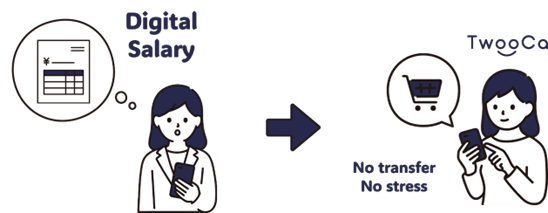 2023年4月に解禁された「給与デジタル払い」のサービス展開を考えております。今回の資金移動業者登録に伴い、給与デジタル払いへの指定申請が可能となりました。当社のメイン利用者である「従業員」に対して、さらなる利便性の向上、キャッシュレスが広がる世界だからこそできる、新しい給与の受け取り方を体感して頂きたく、申請を進めていきたいと考えております。給与をデジタルで受けることにより、「給与」⇒「決済」がよりスムーズになり、そこから得られるデータ活用をもとに、利用者への還元を通じて生活の質向上を考えています。