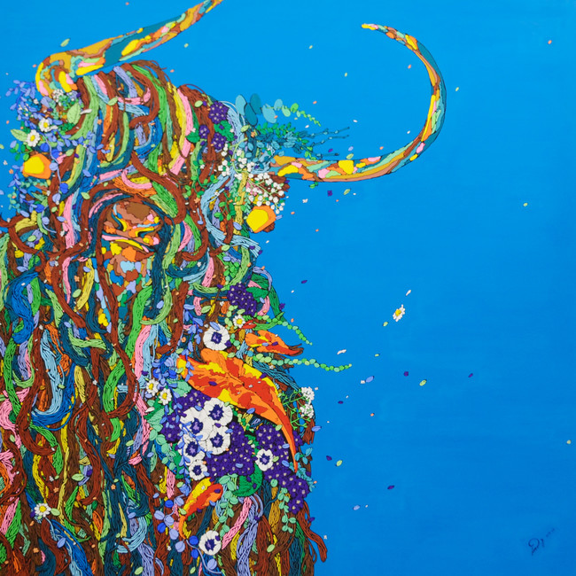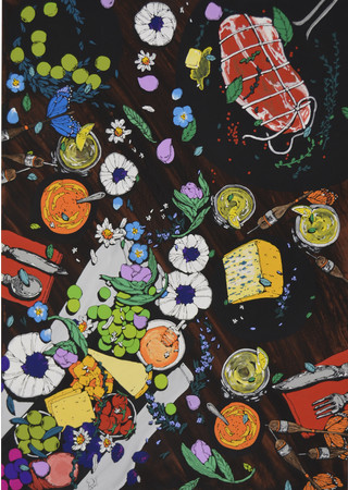 今展では、全長10mのカンバスをテーブルに見立て、そこに並ぶ前菜やメインの肉料理、デザート、コーヒーといった晩餐のフルコースを描いた作品「supper」を会場の中央に展示。「描かれた」フルコース・メニューを超え、そこに集まる「描かれない」人々の楽し気な騒めきが想起される。その他、牛や羊など食肉用に育てられた家畜を描き、フード・ロスの問題を提起する 「shepherd's purse」「pop out」シリーズ、コップ一杯の水への感謝を込めた「The Water of Life」シリーズなど、約40点の作品を展覧する。