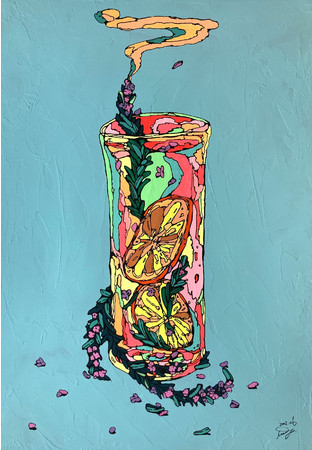 展覧会タイトルの『add a dash of spice to life』とは「人生にひと匙のスパイスを」の意。幼少期から絵を描くこと、料理に触れることに親しんできた画家・icco Yoshimura。自身の作品が、見る人の人生に新たなスパイスを与える存在でありたいとの願いが込められている。