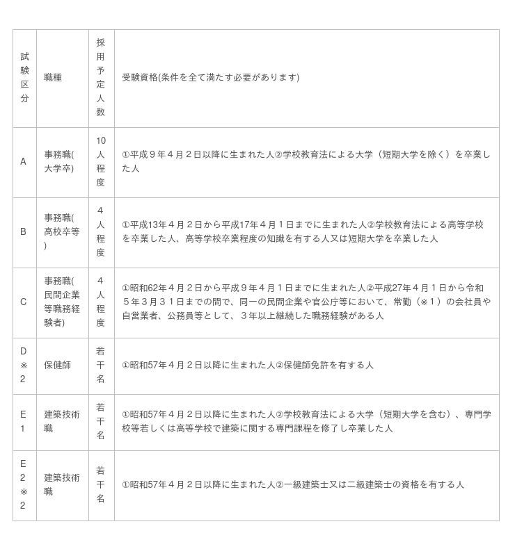 ※2 試験区分D及びE2は、第1次試験の事務能力検査・適性検査を免除し、書類選考とします。