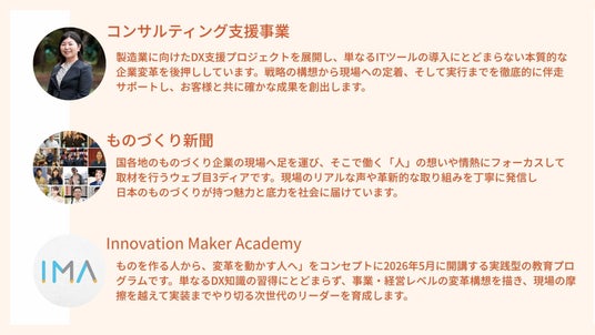 私たちの夢は、ものづくりを通して好奇心と喜びでワクワクし続ける社会の実現です。3つの主力事業を通して、見えない「作る人の想い」と変革の力を掛け合わせ、ものづくり企業と共に心躍る未来をつくり続けます。