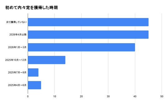 「まだ獲得していない」が45名(29.4%)、「2026年4月以降」も同様に45名(29.4%)で最多となりました。次いで「2026年1月~3月」が40名(26.1%)と続いており、内々定は年明け以降に集中している傾向が見られます。一方で、2025年中に内々定を獲得している学生も23名(15.1%)存在し、早期選考の進展も確認できます。
