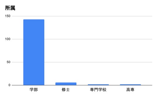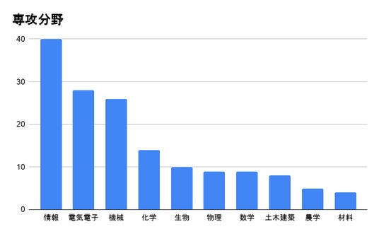 回答者153名のうち、情報系が40名(26.1%)、電気電子が28名(18.3%)、機械が26名(17%)と、情報・機電系の専攻が多くを占める結果となりました。その他にも、化学が14名(9.2%)、生物が10名(6.5%)、土木建築が8名(5.2%)など、幅広い分野から回答が集まっており、理系の傾向を反映した構成となっています。