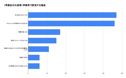 「早く社会に出たいため」が47名(30.7%)、「やりたいことが学部卒でもできるため」が46名(30.1%)と拮抗する結果となりました。一方で、「学費が高いため」、「研究テーマがないため」などの理由も一定数存在しています。進学か就職かを迷いながらも、内々定取得をきっかけに就職を選択するケースも見られ、選択においてはさまざまな意思決定が行われていることがうかがえます。